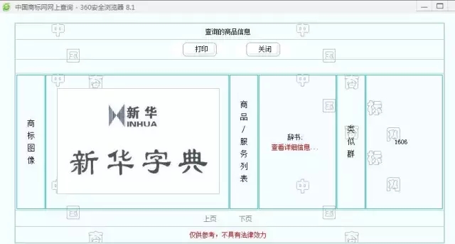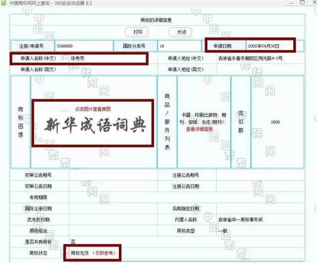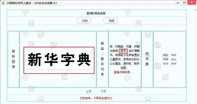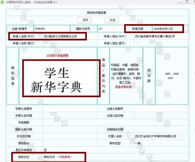笔者以“新华字典”四字进行查询,发现两个注册商标:一是商标注册申请号/注册号19828568,类号16,商标名称“新华字典”,申请人名称“商务印书馆有限公司”;经过查询,该商标于2016年5月3日提出申请,9月27日商标局发送商标受理通知书。目前状态无更新。也就是说,“新华字典”四字作为商标,尚未被正式批准。
