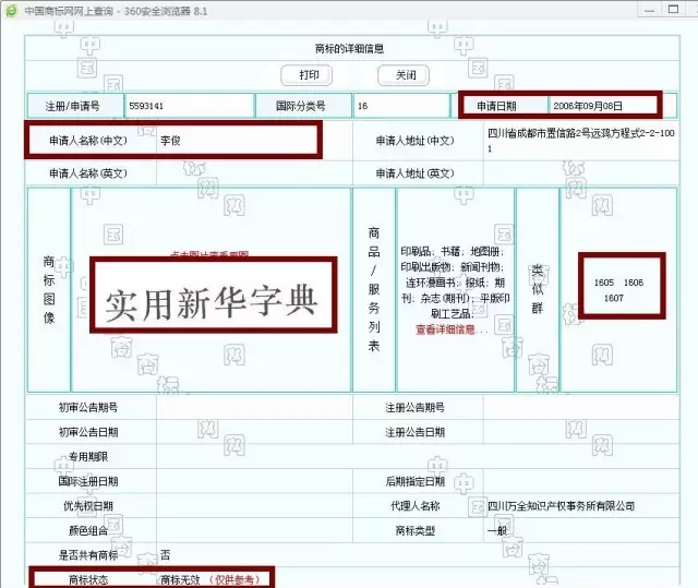 二是商标注册申请号/注册号3571041,类号16,商标名称“新华字典;新华INHUA”,申请人名称“商务印书馆有限公司”。该商标于2003年5月28日注册,2005年5月28日获批。