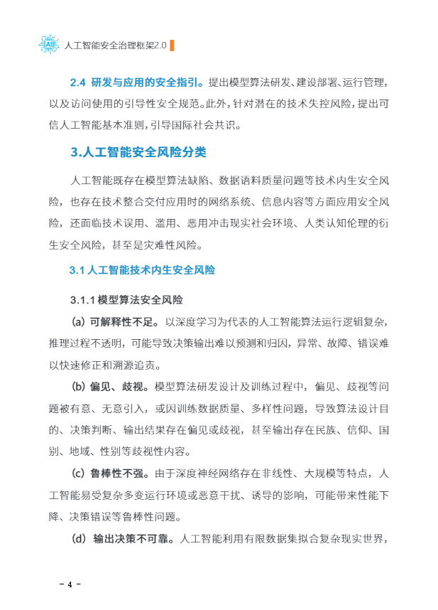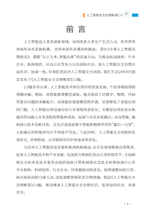 落实《全球人工智能治理倡议》,《人工智能安全治理框架》1.0版(以下简称《框架》)于2024年9月发布,并受到国内外广泛关注。一年来,人工智能技术和应用发展迅速,为应对新机遇新挑战,在国家网信办指导下,由国家互联网应急中心牵头组织人工智能专业机构、科研院所、行业企业联合制定了《框架》2.0版。作为全国网安标委技术文件,《框架》2.0版在2024年《框架》基础上,结合人工智能技术发展和应用实践,持续跟踪风险变化,完善优化风险分类,研究探索风险分级,动态调整更新防范治理措施。