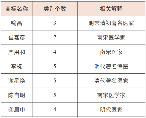 (三)法律依据:《商标法》第四条:自然人、法人或者其他组织在生产经营活动中,对其商品或者服务需要取得商标专用权的,应当向商标局申请商标注册。不以使用为目的的恶意商标注册申请,应当予以驳回。该项条款旨在规范商标申请注册的秩序,打击不以使用为目的、囤积商标注册申请的行为?!渡瘫晟蟛樯罄碇改稀分卸源私辛舜罅康那榭龇治鲇氚咐芯?#xff0c;其中涉及知名人物姓名的亦有相关解释:大量申请注册与知名人物姓名、知名作品或者角色名称等公共文化资源相同或者近似标志的,可构成《商标法》第四条所指的“不以使用为目的的恶意商标注册申请”的情形。例如江西某中医连锁管理有限公司于2020年12月10日提交了33件商标注册申请,指定使用在第3类(化妆品)、第44类(医疗诊所)等7个商品和服务项目上。经查询,该系列商标名称均在江西历史上十大名医姓名之列,具体情况如下表:
