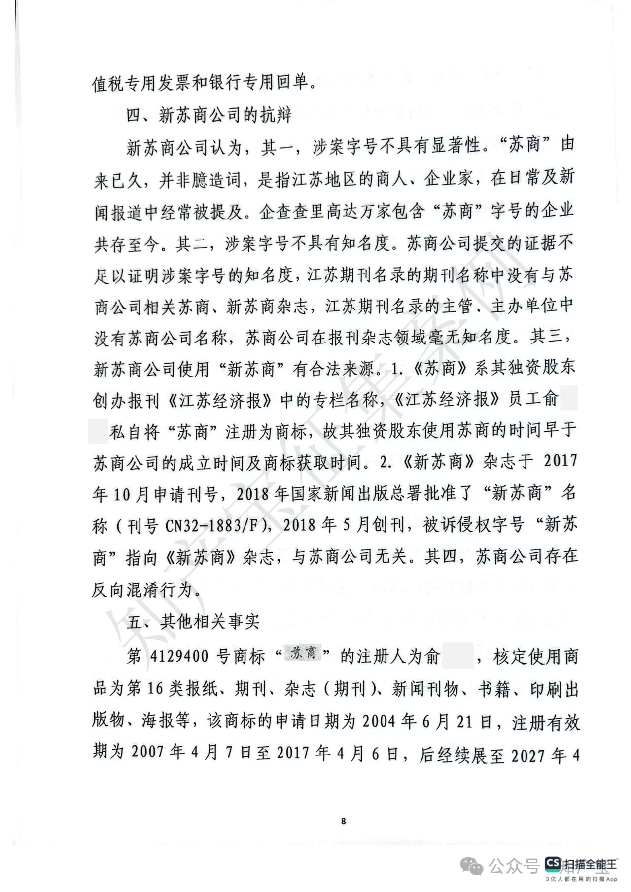 首先,关于江苏苏商传媒集团有限公司主张的“苏商”字号是否构成反不正当竞争法所?;さ摹坝幸欢ㄓ跋斓钠笠得啤?#xff0c;江苏省高院认定“苏商”二字缺乏固有显著性,现有证据不足以证明该字号经苏商公司持续使用后已具备指代或识别其市场主体或服务来源的显著特征。在日常使用及新闻报道中,“苏商”通常被作为指代江苏商人或江苏企业的通用词汇,故苏商公司的“苏商”字号不属于具有一定市场知名度且能区分商品或服务来源的企业名称。其次,关于江苏新苏商文化传媒有限公司注册使用“新苏商”字号的正当性,法院认为其行为不具有攀附苏商公司商誉的故意:其一,新苏商公司系新华报业传媒因《新苏商》杂志采编与经营分离需要而独资设立;其二,虽新华报业传媒注册新苏商公司的时间晚于苏商公司注册“苏商”字号的时间,但新华报业传媒早于苏商公司注册前已在《江苏经济报》中使用“苏商”作为专栏名称宣传江苏商人及商界事件,后于2018年创刊《新苏商》杂志时选择“新苏商”作为名称,创刊词明确“新江苏呼唤新苏商、新时代造就新苏商”,赋予“新苏商”特殊含义及明确指向,旨在服务江苏民营企业与企业家发展。综上,新苏商公司使用“新苏商”字号具有合理背景与正当意图,主观无攀附故意,不构成反不正当竞争法规定的“擅自使用”他人有一定影响企业名称的不正当竞争行为。