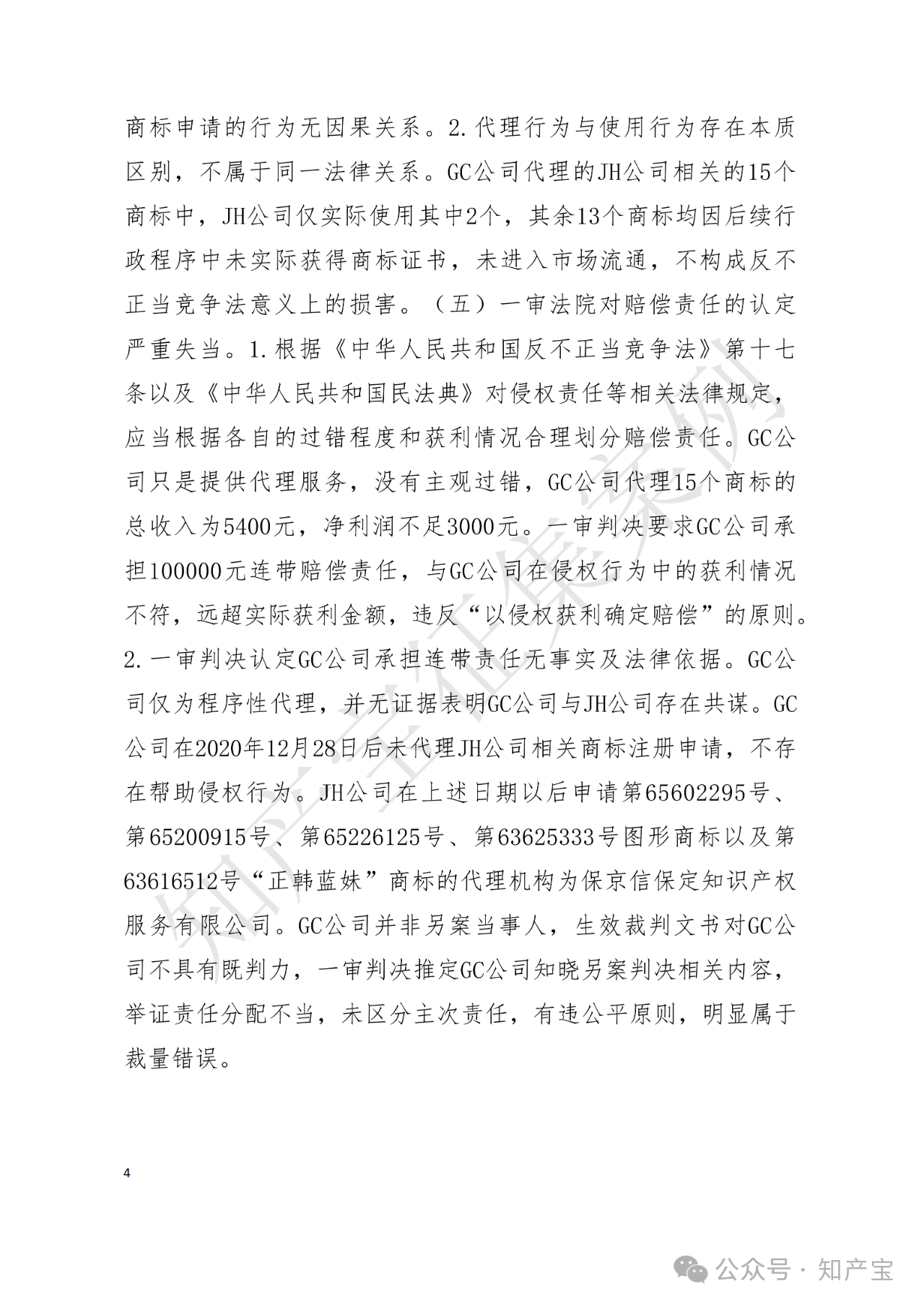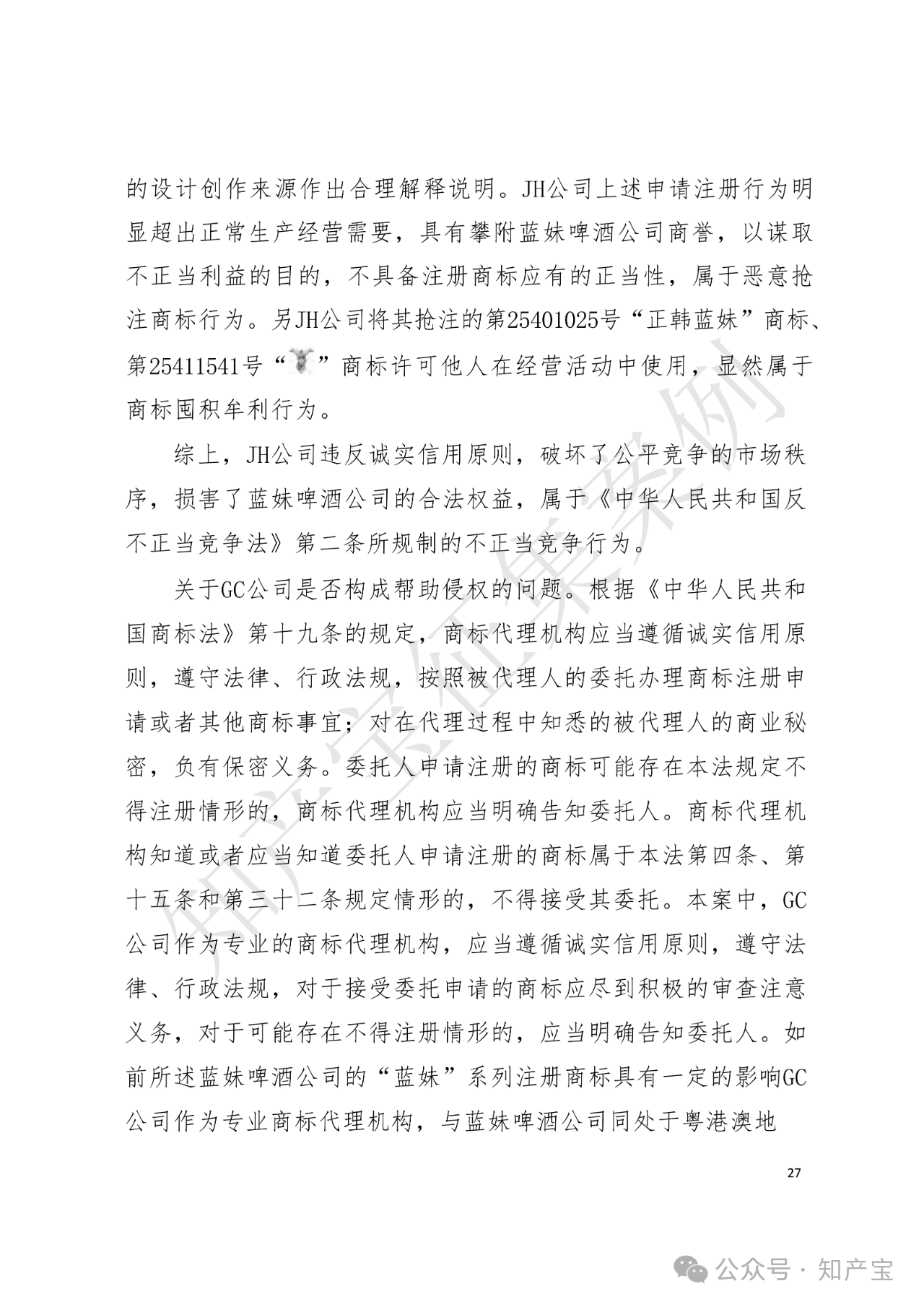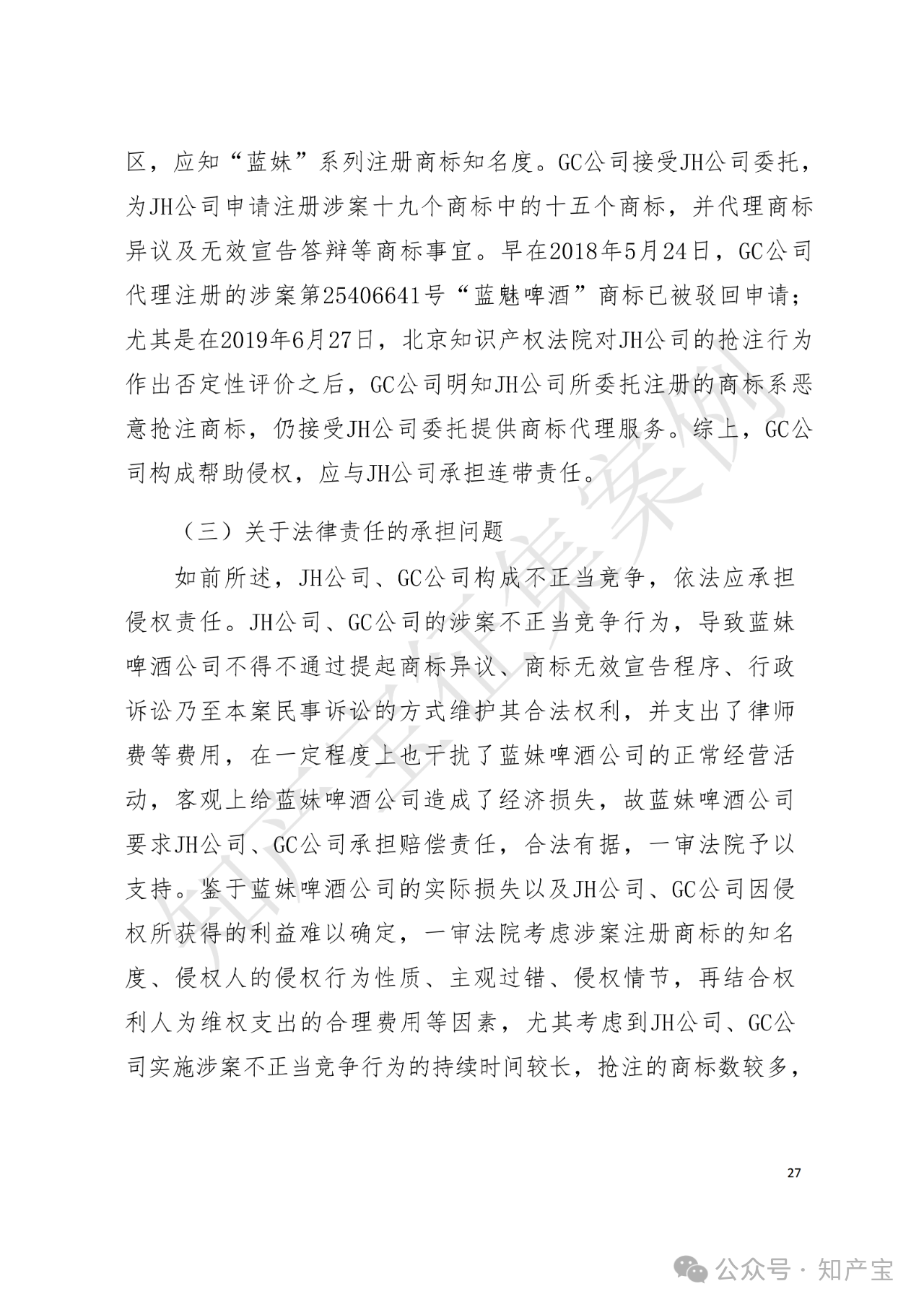 广东JH?**?贸易有限公司作为同行业经营者,明知蓝妹啤酒公司“蓝妹”系列注册商标,仍持续、反复申请注册近似商标,未合理解释商标设计来源,超出正常经营需要,具有攀附商誉、谋取不正当利益的主观恶意,属恶意抢注商标的不正当竞争行为。广州GC知识产权代理有限公司虽抗辩代理行为分属不同程序且商标法第十五条仅规制申请代理,但其代理的15个近似商标申请(含被驳回后仍持续代理)及后续异议、无效宣告答辩行为具有延续性,助益JH公司维持商标持有并授权使用,扩大了蓝妹啤酒公司损失,构成帮助侵权。结合行为持续时间、恶意程度及损害后果,一审认定GC公司对JH公司赔偿义务中的10万元承担连带责任并无不当,GC公司主张赔偿过高缺乏依据,不予采纳。