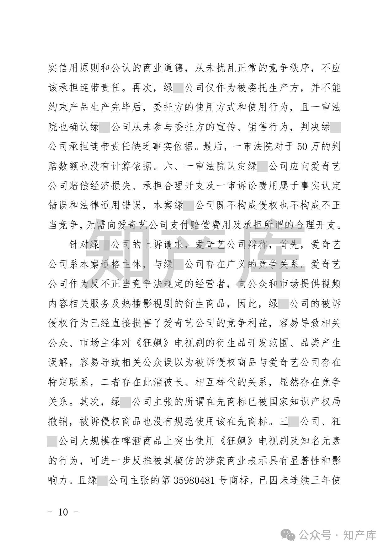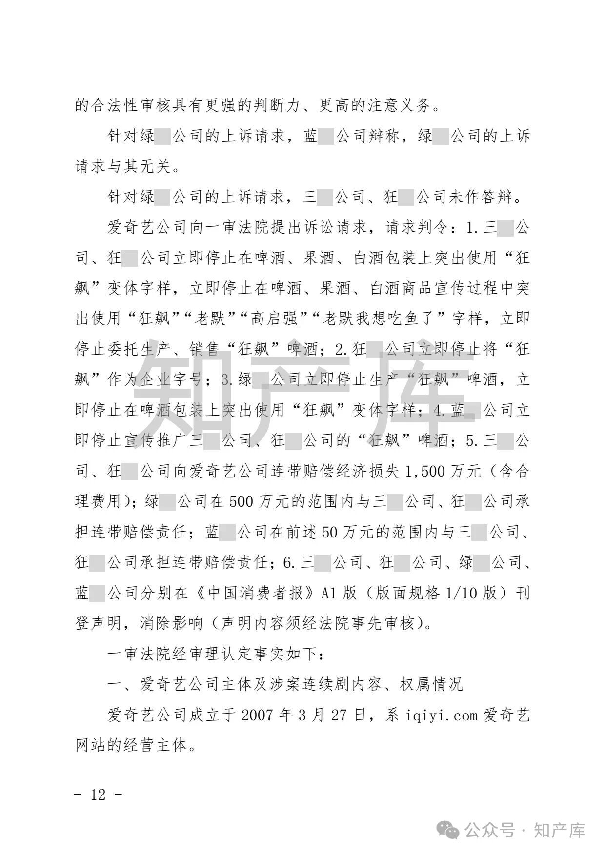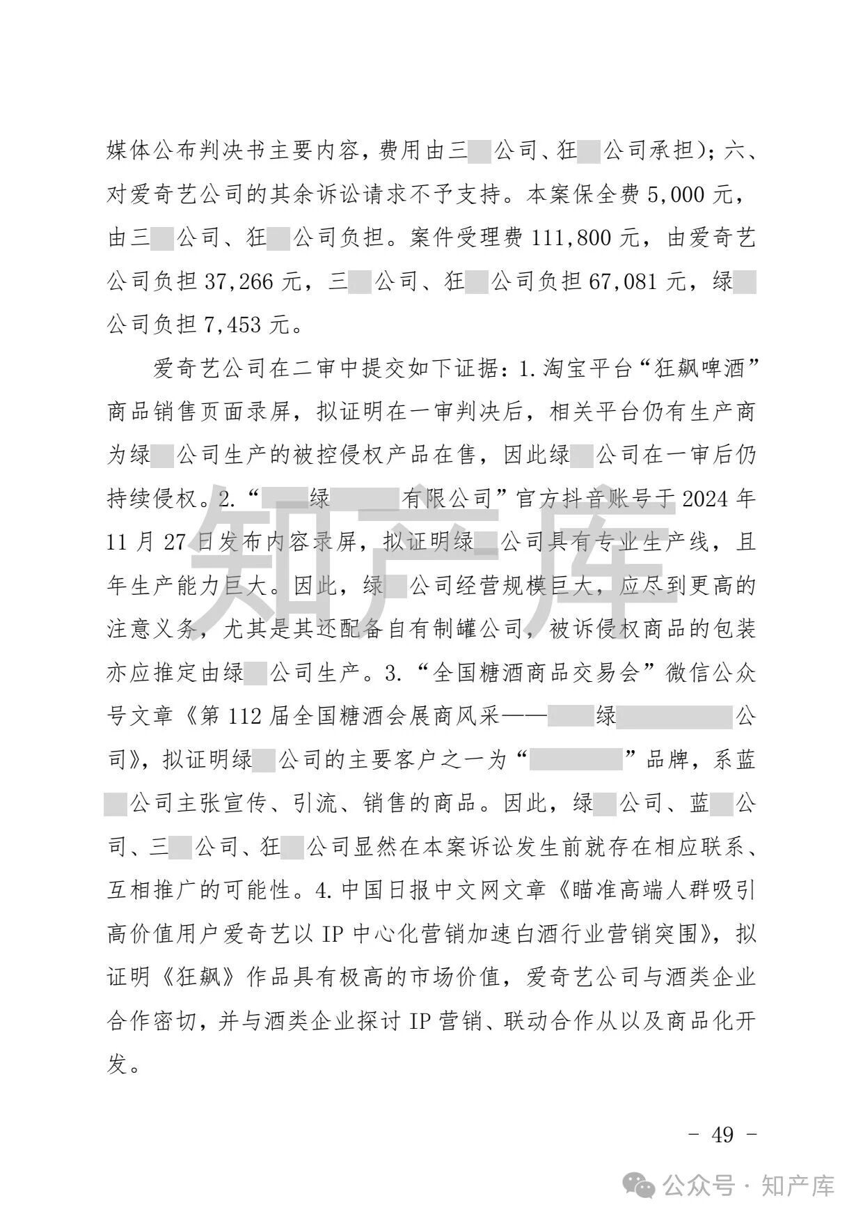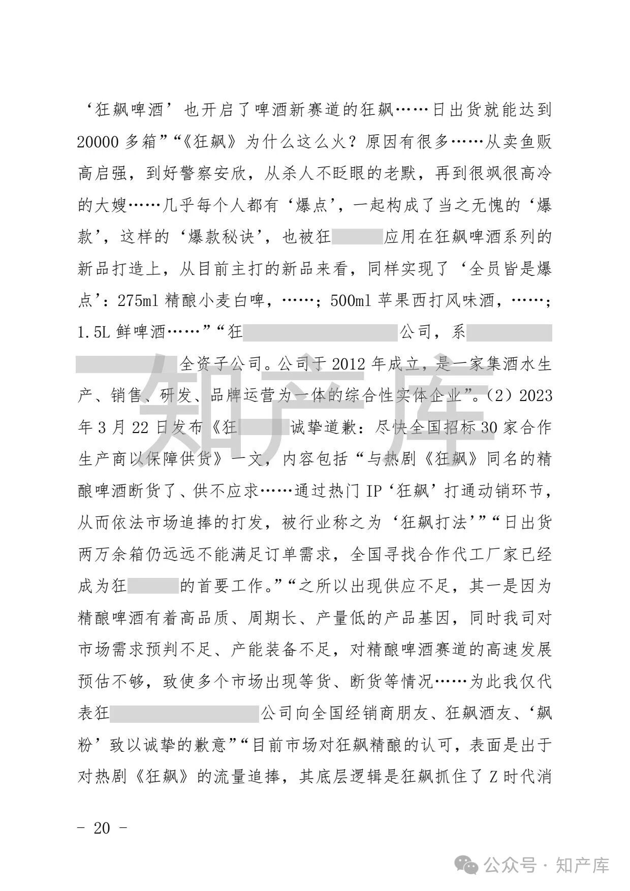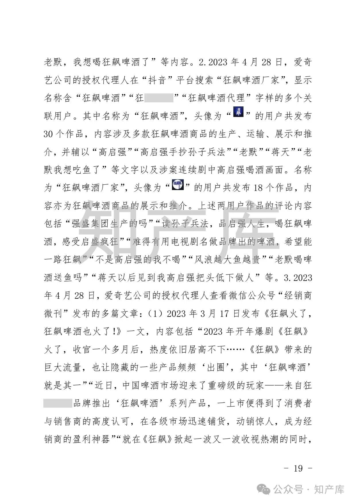 狂飙啤酒聘老默代言蹭剧被爱奇艺起诉,法院判赔500万 二审判决书