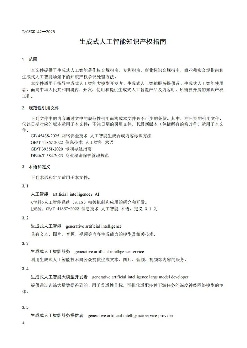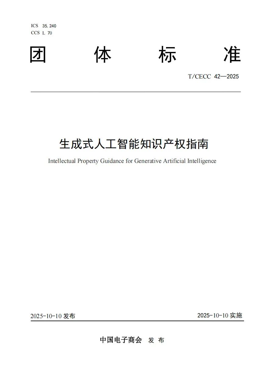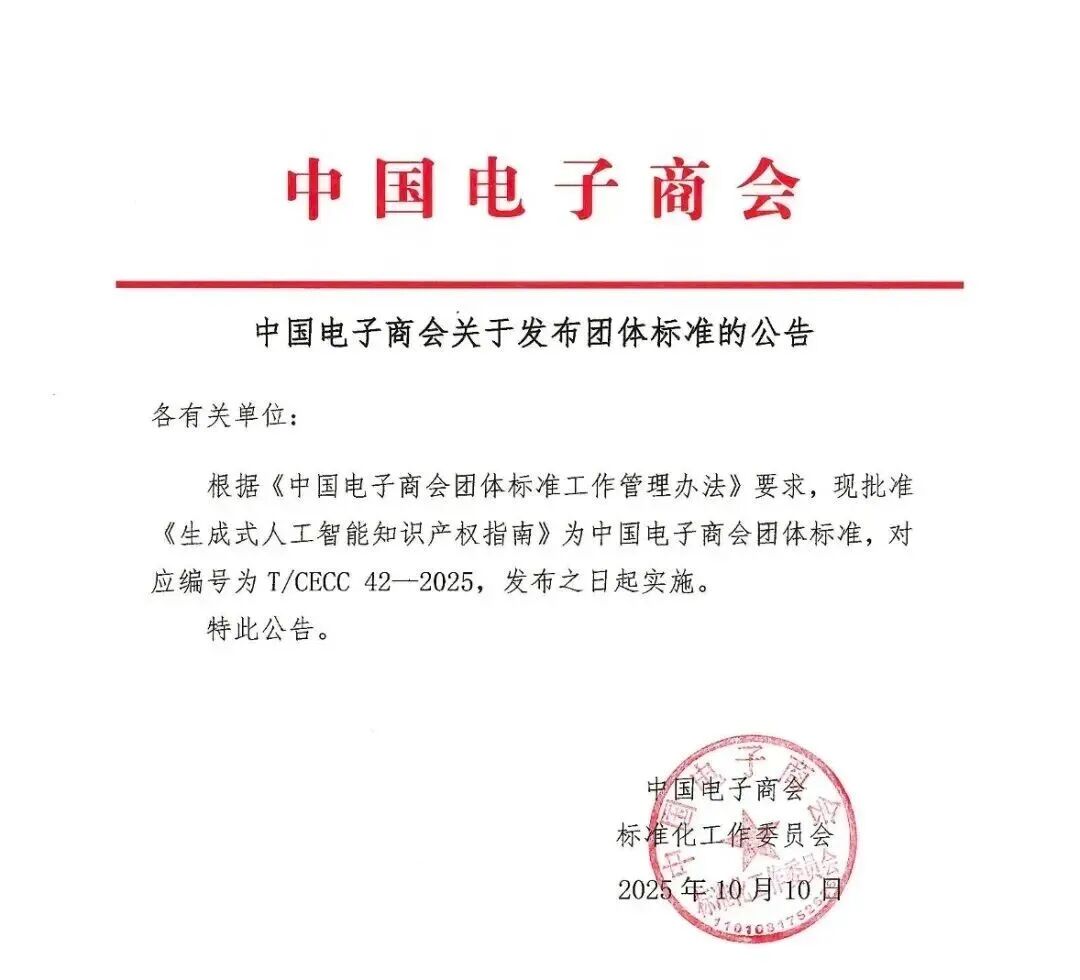 近日,中国电子商会正式发布国内首部聚焦生成式人工智能领域的知识产权团体标准——《生成式人工智能知识产权指南》(T/CECC 42-2025)(以下简称《标准》)。该《标准》作为“标准化+市场监管”团体标准典型案例在海淀区第56届“世界标准日”主题活动暨第四届标准创新大会上进行展示。