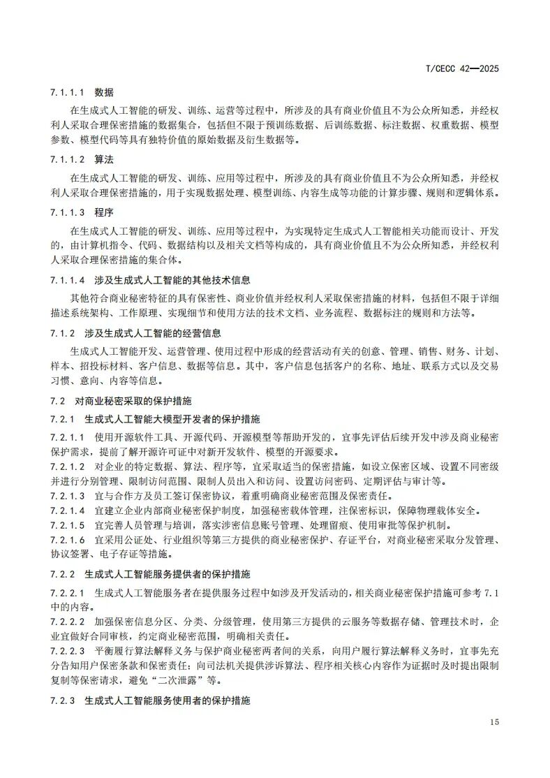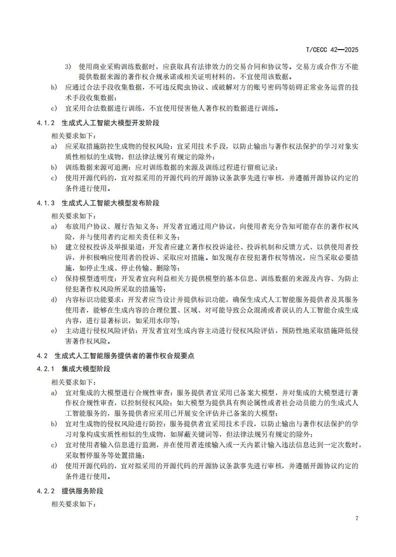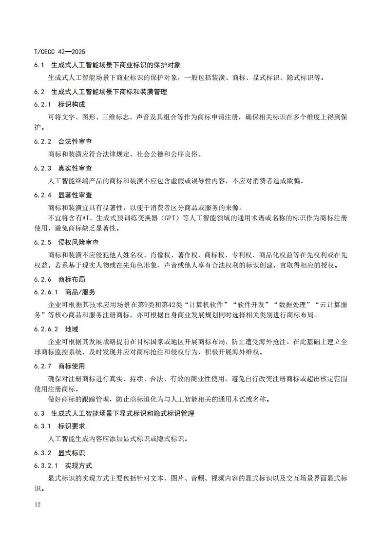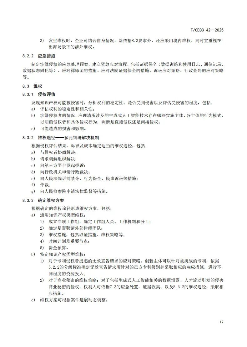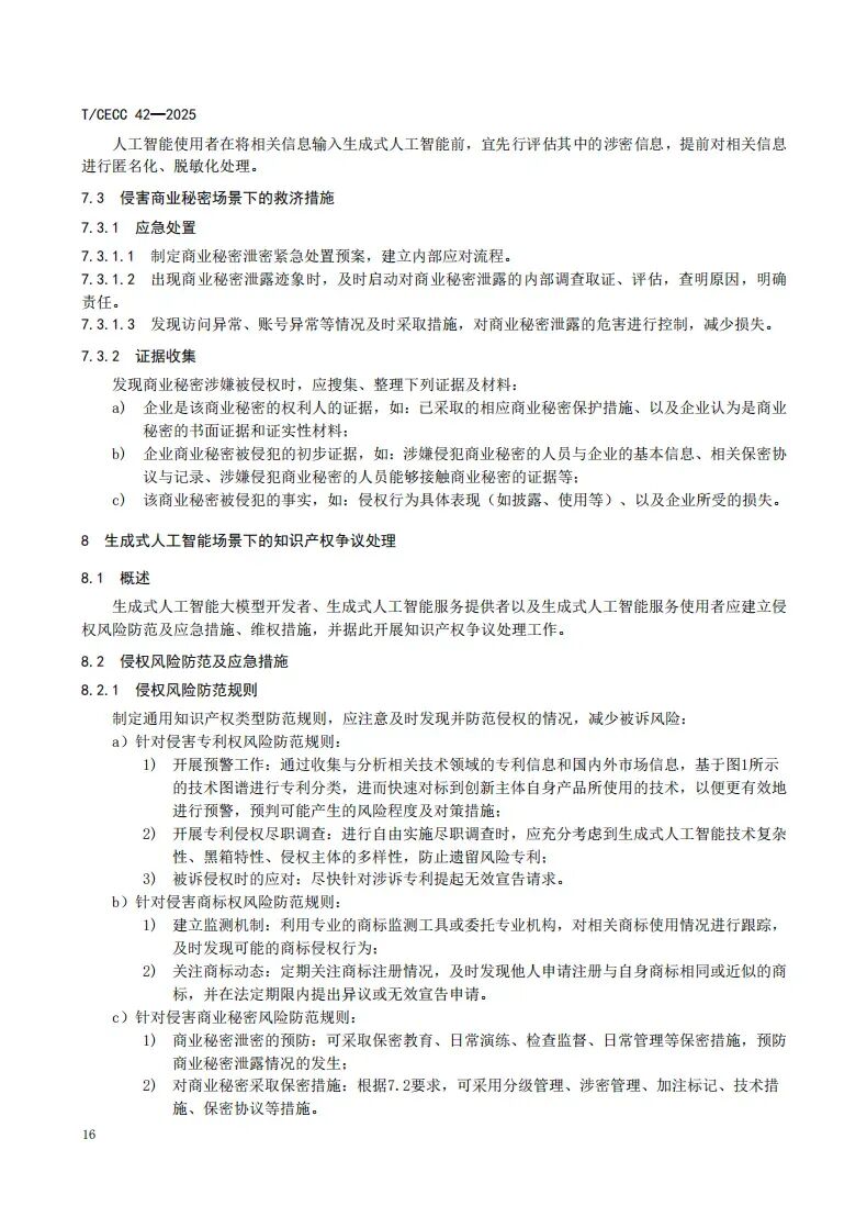 《标准》已于2025年10月10日起正式实施,为生成式人工智能不同场景下的主体提供了明确的应用价值:生成式人工智能大模型开发者可依指南明确数据合规、专利?;ぁ⑸桃得孛芄芾硪?#xff0c;降低侵权风险;生成式人工智能服务提供者可依指南开展大模型审查、投诉渠道搭建等业务,平衡服务效率与知识产权保护;生成式人工智能服务使用者可依指南在使用前进行规范的信息确认、在使用中合理有效留痕,厘清合规边界?!侗曜肌坊棺派栌兄恫ㄕ榇碜ㄕ?#xff0c;为各主体提供侵权风险防范、应急措施及多元维权途径,助力各方主体高效应对知识产权纠纷。
