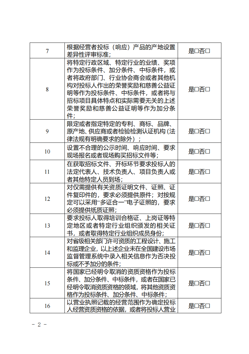 16.以营业执照记载的经营范围作为确定投标人经营资质资格的依据,或者将投标人营业执照记载的经营范围采用某种特定表述或者明确记载某个特定经营范围细项作为投标条件、加分条件、中标条件,或者以招标项目超出投标人营业执照记载的经营范围为由限制投标;