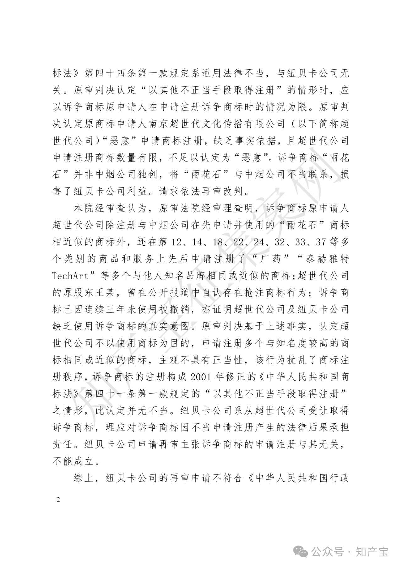最高院经审查认为,原审法院经审理查明,诉争商标原申请人超世代公司除注册与中烟公司在先申请并使用的“雨花石”商标相近似的商标外,还在第12、14、18、22、24、32、33、37等多个类别的商品和服务上先后申请注册了“广药”“泰赫雅特TechArt”等多个与他人知名品牌相同或近似的商标;超世代公司的原股东王某,曾在公开报道中自认存在抢注商标行为;诉争商标已因连续三年未使用被撤销,亦证明超世代公司及纽贝卡公司缺乏使用诉争商标的真实意图。原审判决基于上述事实,认定超世代公司不以使用商标为目的,申请注册多个与知名度较高的商标相同或近似的商标,主观不具有正当性,该行为扰乱了商标注册秩序,诉争商标的注册构成2001年修正的《中华人民共和国商标法》第四十一条第一款规定的“以其他不正当手段取得注册”之情形,此认定并无不当。纽贝卡公司系从超世代公司受让取得诉争商标,理应对诉争商标因不当申请注册产生的法律后果承担责任。纽贝卡公司申请再审主张诉争商标的申请注册与其无关,不能成立。