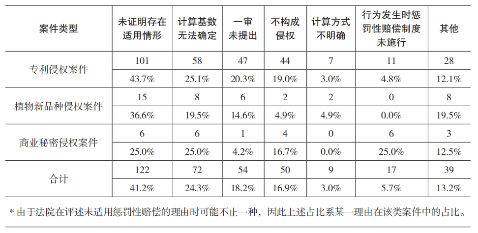 *由于法院在评述未适用惩罚性赔偿的理由时可能不止一种,因此上述占比系某一理由在该类案件中的占比。