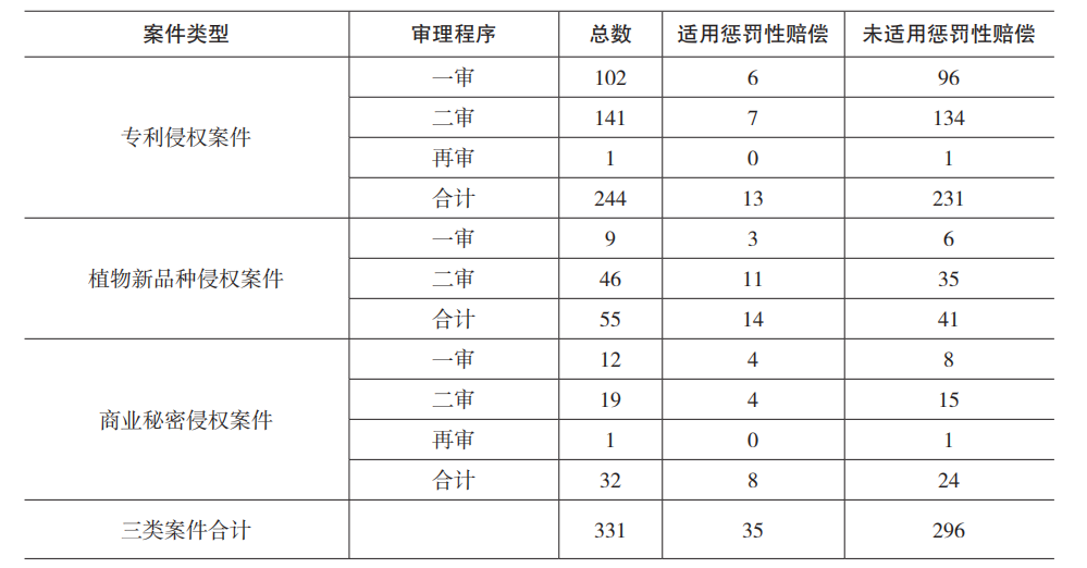 本研究首先以检索方式从中国裁判文书网筛选出既包含当事人提出惩罚性赔偿请求、也包含法院针对惩罚性赔偿的适用进行具体评述的专利、植物新品种与商业秘密侵权案件。考虑到不同知识产权法和《民法典》惩罚性赔偿制度实施时间不同,本研究进一步筛选裁判年份在对应法律施行后的案件。截至2025年6月15日,获取的初步样本为专利案件674件,植物新品种案件65件,商业秘密案件37件。经核查,进一步剔除以下情形:一为仅笼统地提出“请求加重处罚”“考虑惩罚性赔偿因素”但实质上主张适用法定赔偿而非惩罚性赔偿的案件;二为仅在质证意见或答辩意见中提及“惩罚性赔偿”的案件;三为重复、无关的案件。最终形成的有效样本包含专利案件244件,植物新品种案件55件,商业秘密案件32件。上述样本为本研究数据处理与分析的基础。