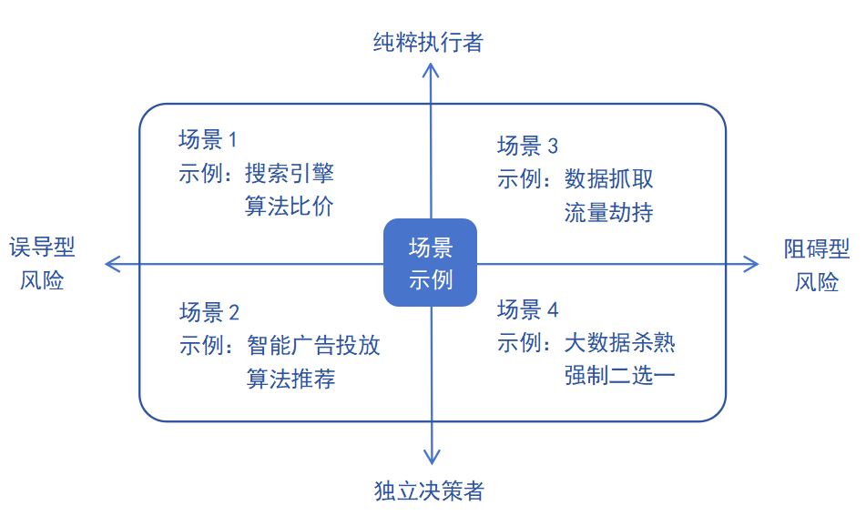(2)以算法对市场竞争所产生的风险类型,将基准分为误导型风险和阻碍型风险,前者主要指平台滥用算法手段制造“信息茧房”“信息误导”效果,以至于影响消费者理性决策或其他经营者的交易决定权,如利用算法进行刷单炒信以误导、欺骗消费;后者主要指平台利用算法手段,阻碍其他经营者提供更优产品或服务,从而妨碍正常的市场竞争机制,如利用搜索降权、限制流量等较为隐蔽的算法手段,变相制造恶意不兼容状态进而阻碍、妨害其他竞争对手。在两基准的基础上,可将行为模式例举为4个主要场景,算法对平台决策的影响程度从场景1到场景4不断深化,算法对竞争行为的自主性和主导性也越来越强。相应的,对平台算法的正当性审查标准及违法性推定规则趋向严格,平台所应承担的主体责任和义务也随之增加。