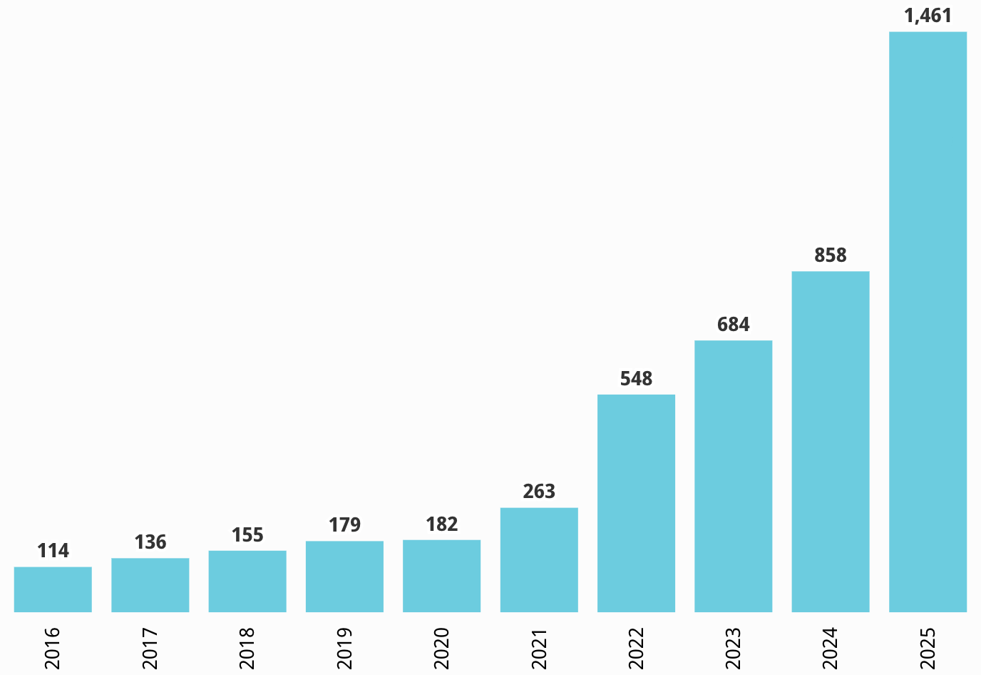 2025年,中心支持管理了1461件涉及知识产权、创新和技术的争议案件,较2024年增长70%,其中既包括中心根据《WIPO调解规则》和《WIPO仲裁规则》管理的案件,也包括中心与成员国知识产权局和版权局共同管理的案件,展现出各方对WIPO知识产权替代性争议解决服务的参与度持续提升。