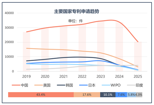 这一变化部分受国外申请量持续收缩影响,其从2019年的4.4万件降至2023年的4.2万件。与之相比,中国申请量保持韧性,于2023年达到峰值3.5万件,全球占比持续提升,已成为驱动全球专利布局的核心区域。