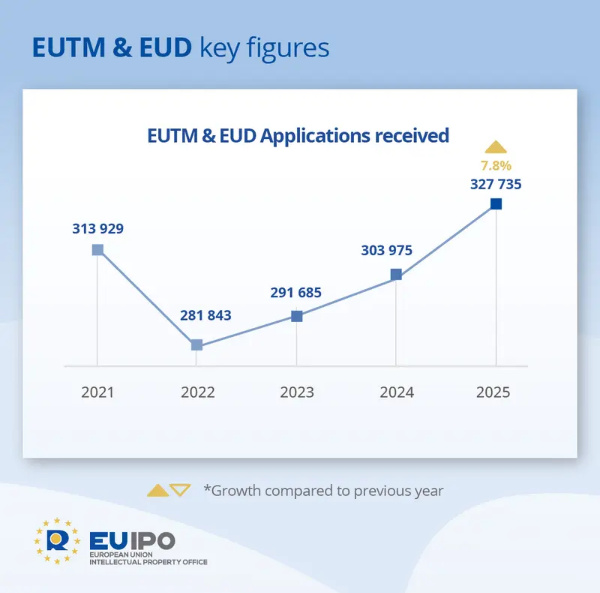 中国知识产权律师网从EUIPO获悉,2025年,欧洲知识产权局(EUIPO)共收到327,735份欧盟商标(EUTM)和欧盟外观设计(EUD)申请。这是该机构自1996年开始受理申请以来,年度知识产权申请数量的最高纪录。