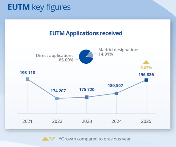欧盟商标在2025年申请总量中占比最大。EUIPO共收到196,886件欧盟商标申请,较2024年增长了9.1%。