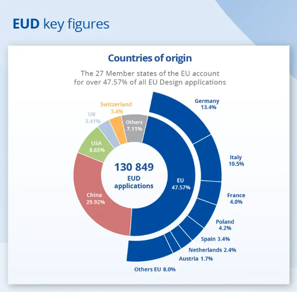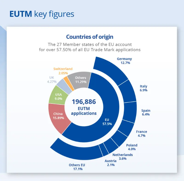 在欧盟内部,申请量由德国领先(13.4%),其次是意大利(10.5%)、波兰(4.2%)、法国(4%)和西班牙(3.4%)。