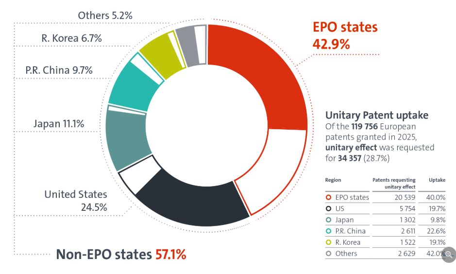 2023年6月启动的统一专利体系为创新者提供了更简单、更便捷的专利?;?#xff0c;覆盖18个欧盟成员国,只需向EPO提出单一请求即可获得专利?;?。2025年授予的欧洲专利中,有34,357项申请了统一?;?#xff0c;占所有授权的约28.7%(较2024年的25.6%有所上升)。2025年,欧洲人的整体采纳率为40.0%,高于预期。在欧洲大学、公共研究机构、中小企业和微型实体中,单一专利的比例为48.3%(较2024年的38.4%有所上升),这证明了单一专利对小型创新者的吸引力。来自欧洲以外的地区对该体系的兴趣稳步上升,中国专利权人的采纳率显著提升(22.6%,较2024年的17.8%有所上升)。来自加拿大、澳大利亚、印度、以色列、香港(SAR)和台湾(中国省份)的专利权人采纳率显著更高,采纳率与欧洲相当甚至更高。