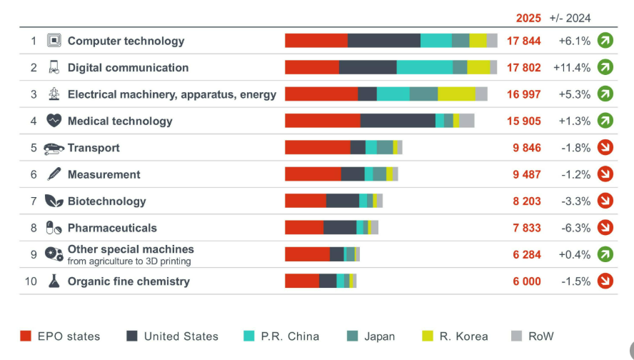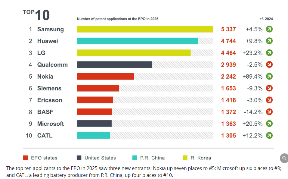 2025年EPO前十名申请者中有三家新晋者:诺基亚上升七位至第5;Microsoft上升六位至第9;以及来自中国的领先电池制造商宁德时代,上升四位至第10。