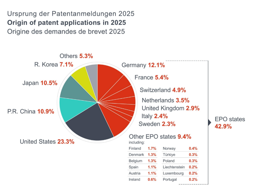 2025年,向EPO提交的专利申请数量创纪录——201,974件,较前一年增长1.4%。来自欧洲专利组织39个成员国的申请增长0.4%(其中欧盟27国增长0.7%),而来自欧洲以外的申请则增长2.1%。