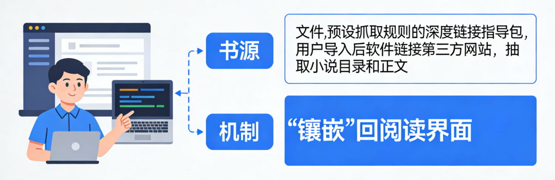葛某某开发的“×读”软件及其“书源”机制,正是深度链接技术的深度应用?!笆樵础蔽募局噬鲜且桓龈鲈ど枇俗ト」嬖虻纳疃攘唇又噶畎5庇没У既肽掣觥笆樵础焙?#xff0c;软件便能按照指令链接至第三方网站,抓取特定小说的目录和正文内容,并“镶嵌”回“×读”软件的阅读界面之中。在用户感知体验上,自己始终是在一个干净、统一的“阅读”软件内享受完整的阅读服务,全然不知内容实则来自网络深处散布的各处盗版站点。