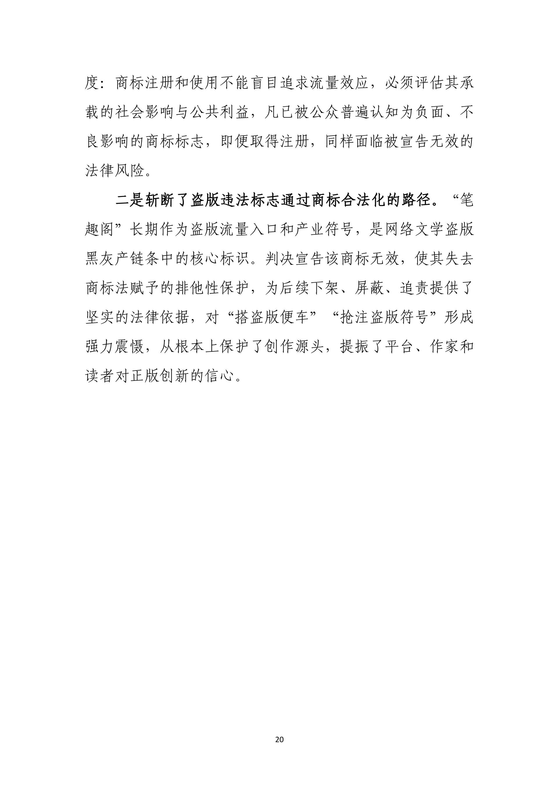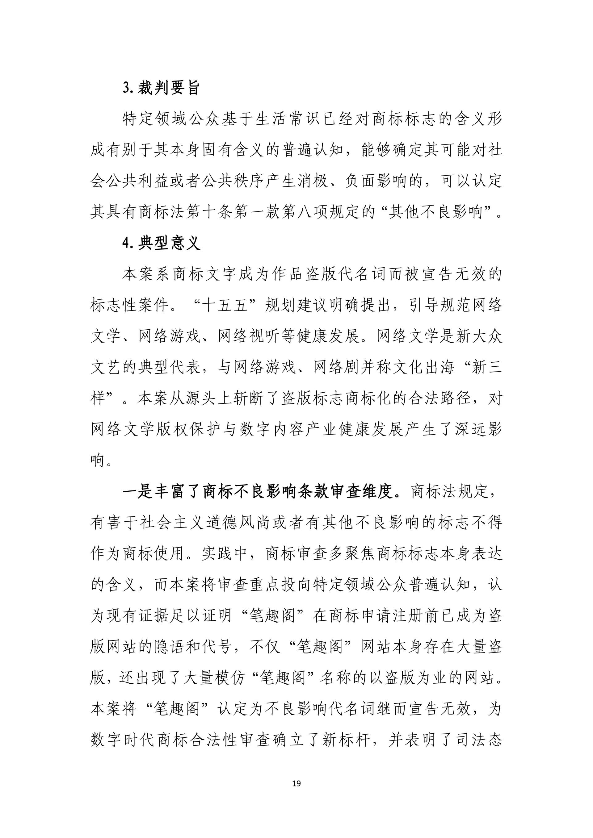 在践行核心价值观、助力社会治理现代化方面,通过英红地理标志系列案、抄袭现有技术恶意申请专利行政案、复合肥问题专利案、阿里云盘案、笔趣阁不良影响案、爱星盘案,依法规制恶意申请、囤积商标、滥用权利等行为,完善协同治理、平台责任与网络空间治理规则。